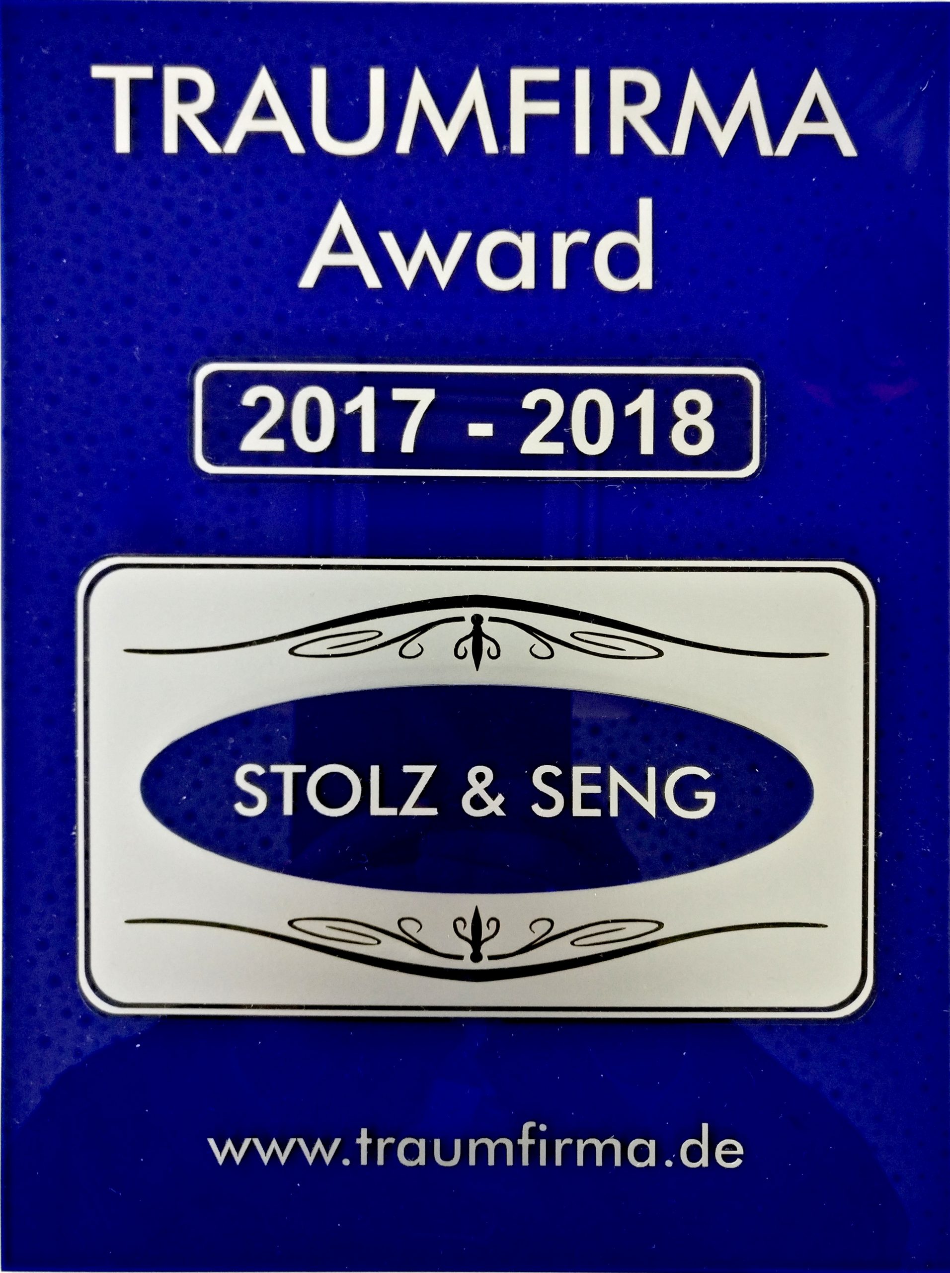 Der TRAUMFIRMA-Award wird nur an Unternehmen verliehen, die sich durch eine besonders mitarbeiterfreundliche und wertschätzende Unternehmenskultur auszeichnen. Er basiert im Wesentlichen auf einer absolut anonymen Mitarbeiterbefragung. Die dadurch sehr ehrliche Bewertung der Mitarbeiter spiegelt die Realität im Unternehmen am besten wieder. Das heißt, die kollektive Beurteilung der Mitarbeiter entscheidet überwiegend, ob sie in einer Traumfirma arbeiten. Stolz & Seng hat damit  – zusammen mit weiteren Kriterien – die Voraussetzungen zum Erhalt des TRAUMFIRMA-Awards für zwei Jahre erfüllt.
